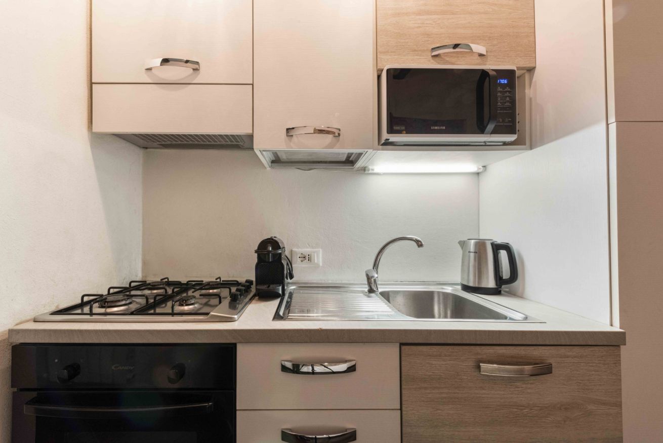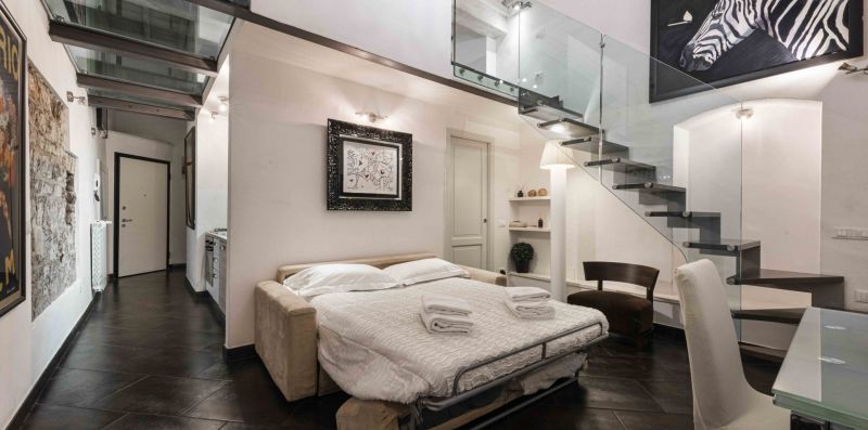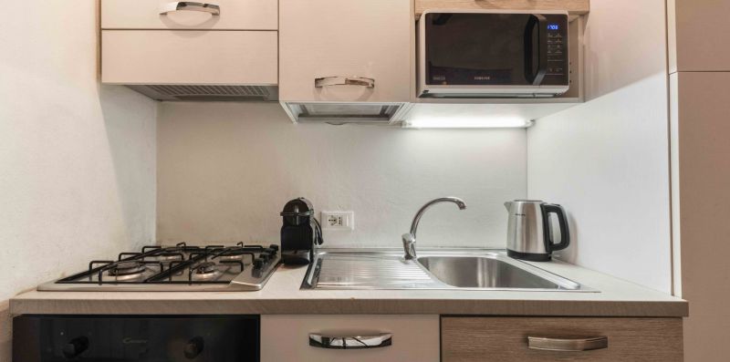 The first floor features a bright and welcoming living area, with a comfortable lounge ideal for relaxing after a day spent exploring museums and shopping, and a modern and functional kitchenette complete with an oven, washing machine, and everything you need to prepare your own meals.