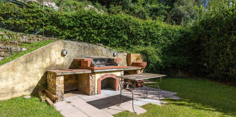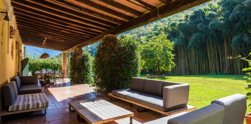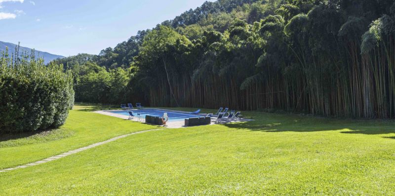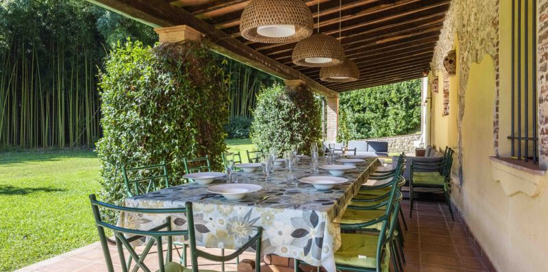 Surrounded by a tall and lush bamboo forest, the property boasts a large garden with lawn, brick barbecue, and private parking for 5 cars. Under the long patio you will find a lounge area with armchairs and sofas, and a dining table for 12 people, ideal for alfresco meals.