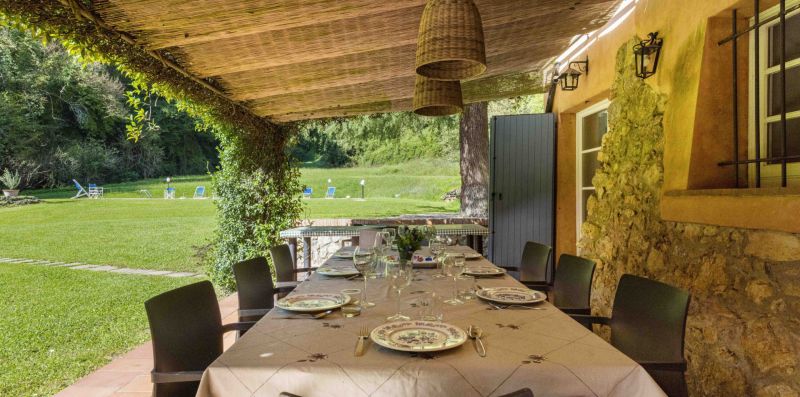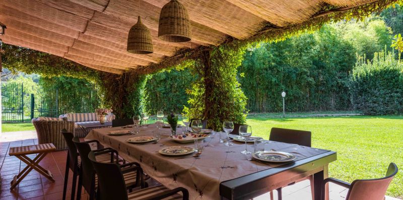 Under the pergola with climbing plants there is a lounge area with sofas, and a dining table for 8 people, perfect for outdoor meals with friends.