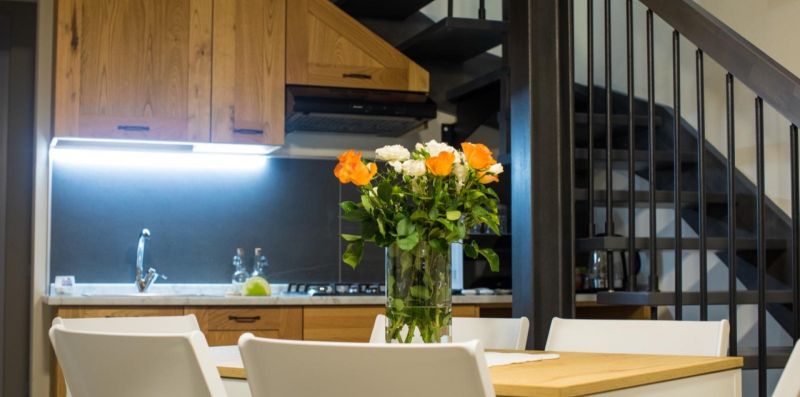 Apartment 1: This apartment is spread over 2 floors and can sleep up to 9 people. On the ground floor there is a kitchen equipped with a dining table for 6 people, tv, and double sofa bed. Following is a laundry room (with washing machine, iron and ironing board), a double bedroom, and a bathroom with shower.