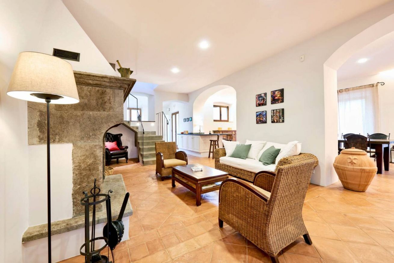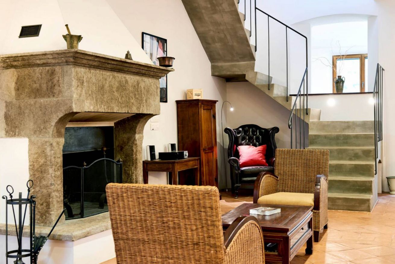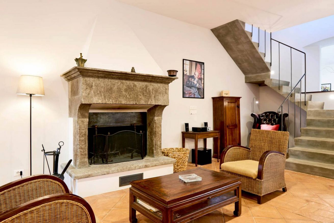First floor: A small and charming loggia leads to the upper floor, which hosts a second lounge with single sofa bed, armchairs, and fireplace, as well as a dining room and a second fully equipped kitchen, ideal for large groups or to provide greater autonomy to guests.