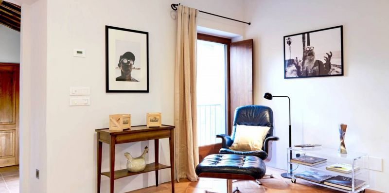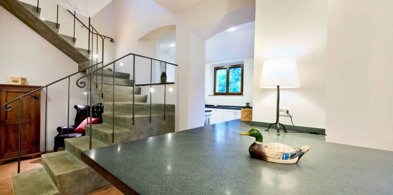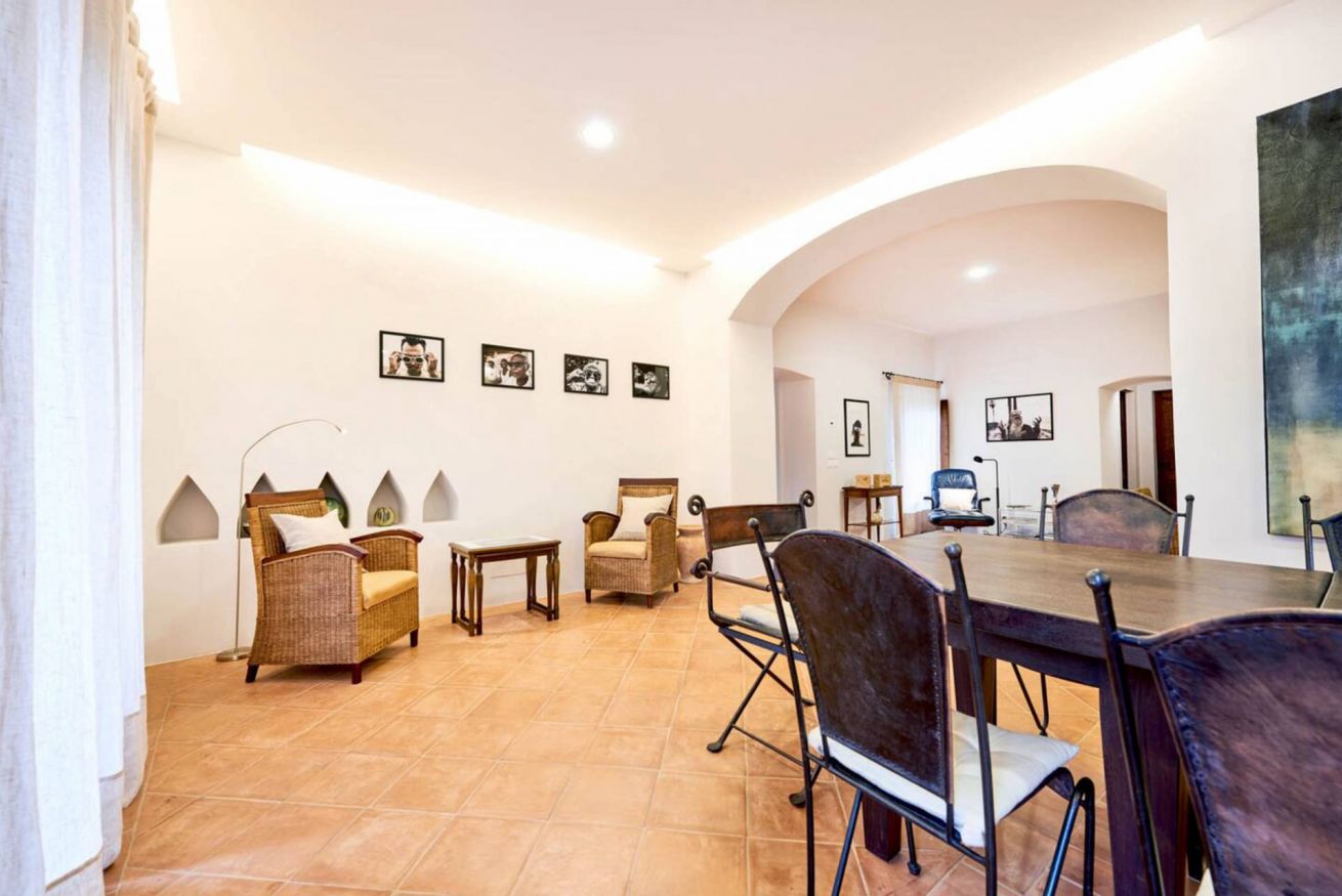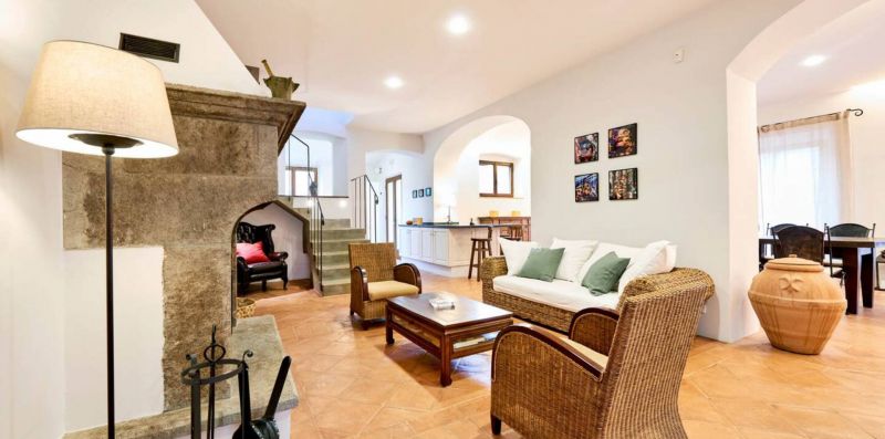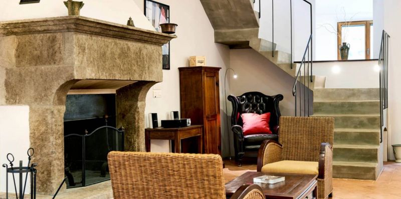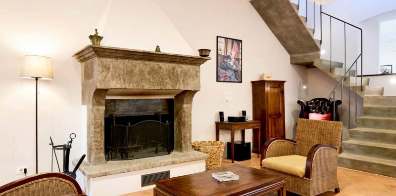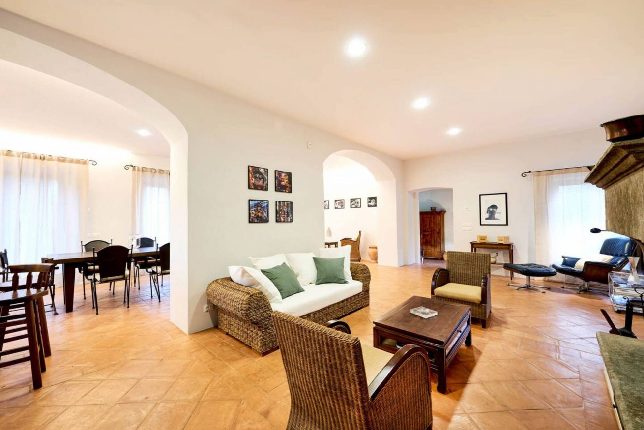 First floor: A small and charming loggia leads to the upper floor, which hosts a second lounge with single sofa bed, armchairs, and fireplace, as well as a dining room and a second fully equipped kitchen, ideal for large groups or to provide greater autonomy to guests.