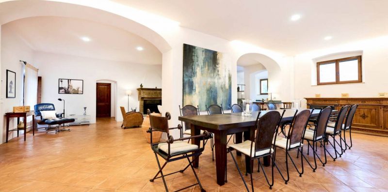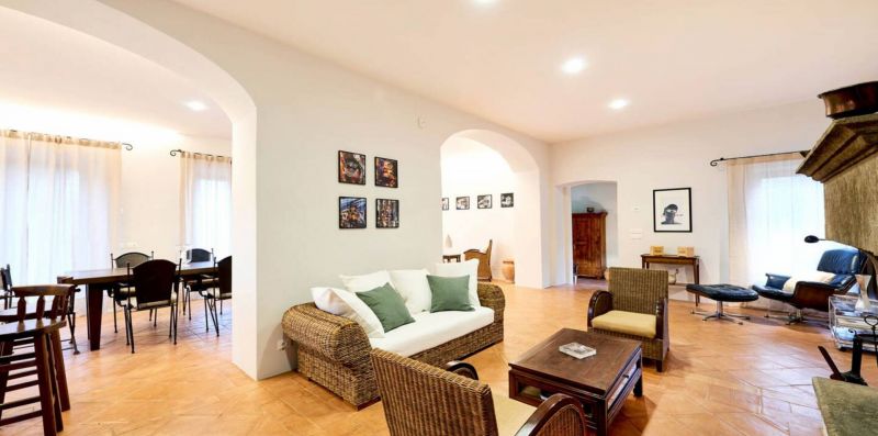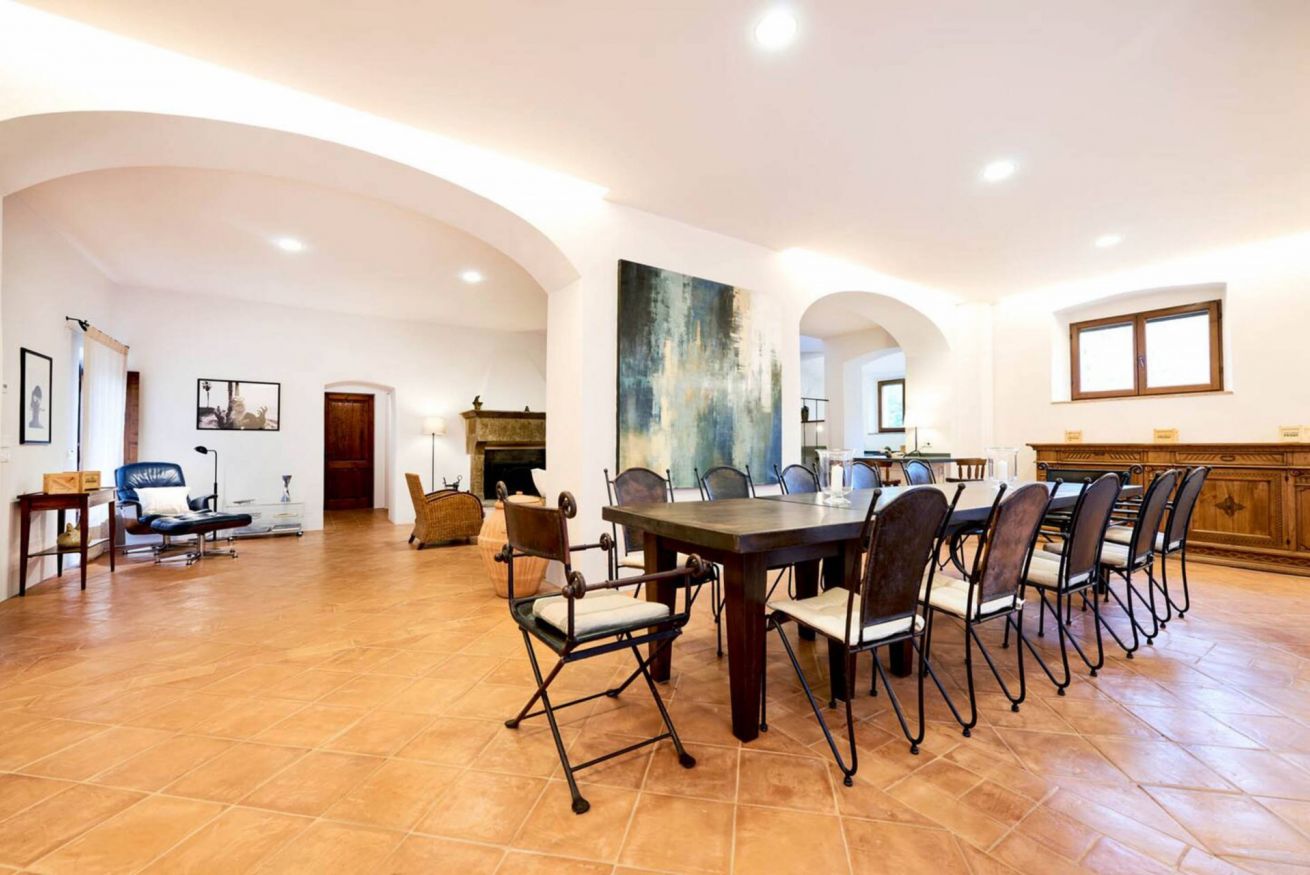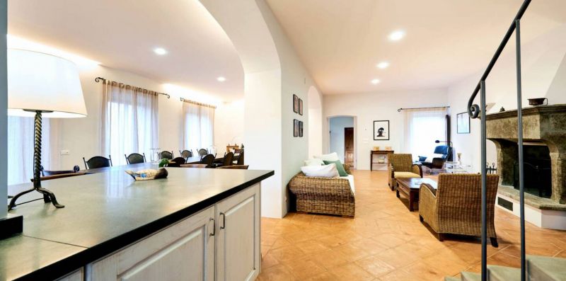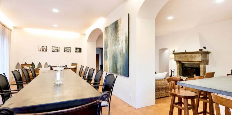 Ground floor: The ground floor opens directly onto the large panoramic terrace, creating a pleasant continuity between indoor and outdoor spaces. Here unfolds a spacious and bright open-plan living area, consisting of a dining area with a large table for 12 people and a cozy lounge with sofas, armchairs, and a fireplace, ideal for social gatherings in every season.