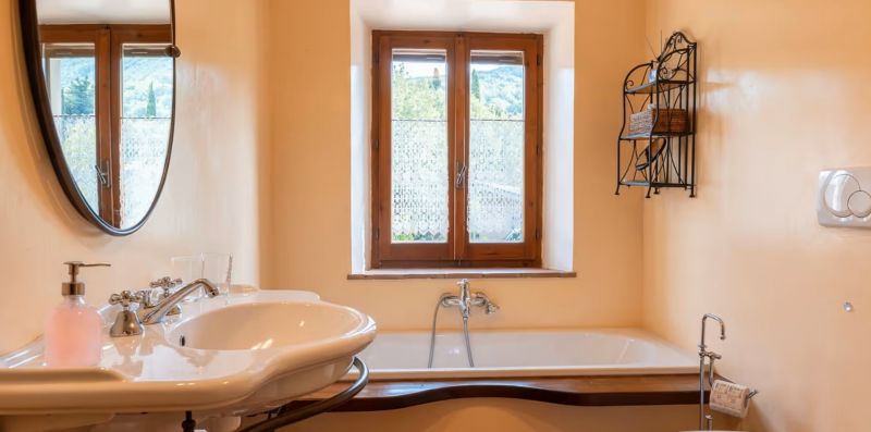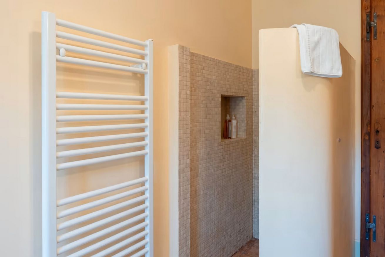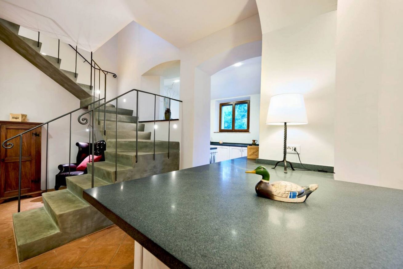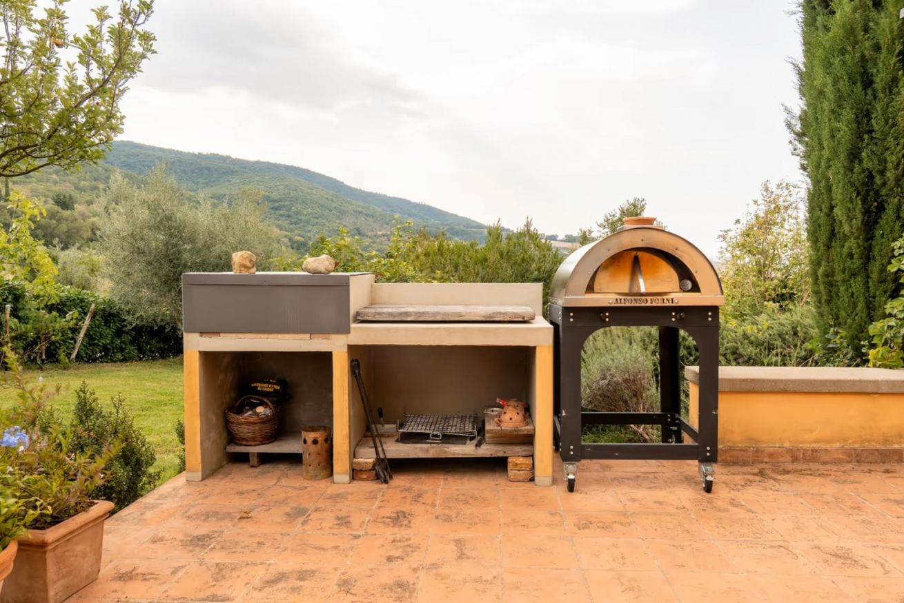 The outdoor areas are completed by a spacious panoramic terrace, furnished with an iron pergola with a fabric cover, barbecue, and two dining tables seating up to 14 guests, ideal for enjoying al fresco meals immersed in the silence and scents of the Tuscan countryside.