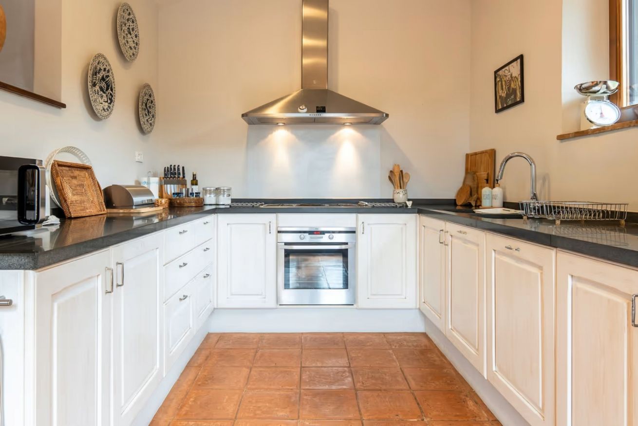 Adjacent to the living room is a spacious, fully equipped kitchen, designed to meet every need.