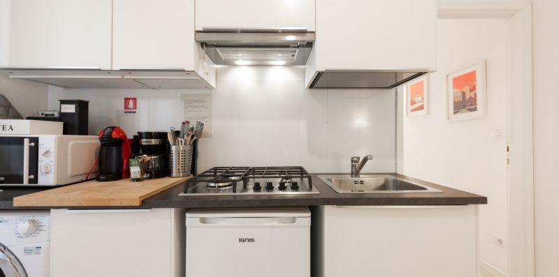 Located on the ground floor, the apartment offers an open-plan living area, where the fully equipped kitchen integrates with the cozy living room. Here you'll find everything you need: a dishwasher, microwave, and washer-dryer, for maximum convenience.