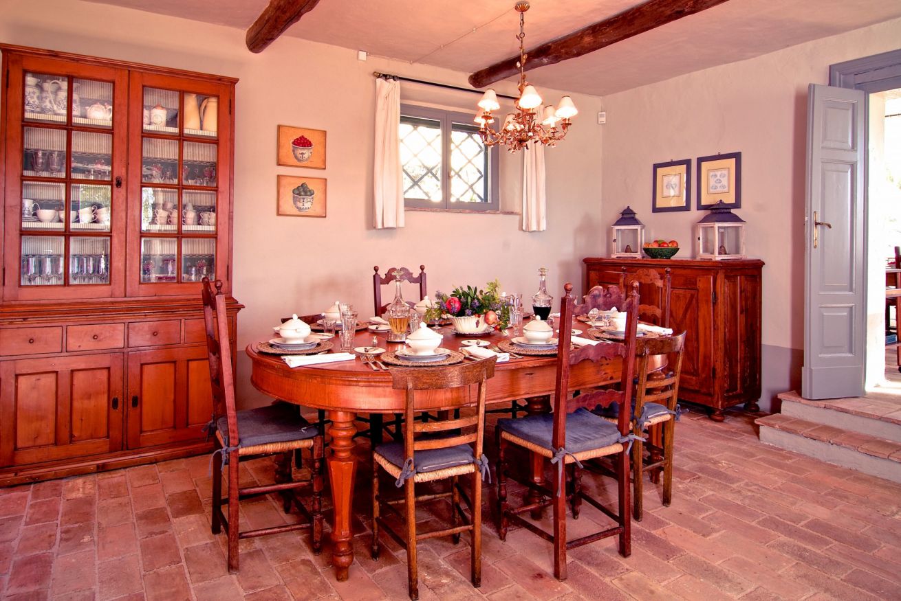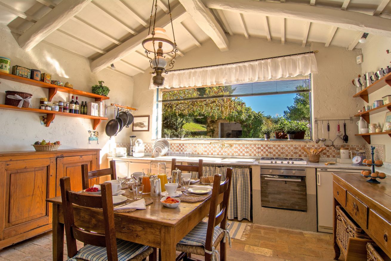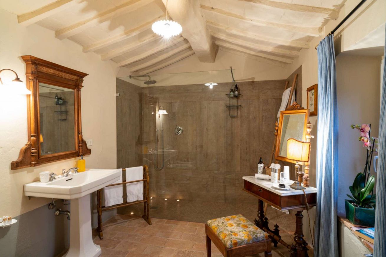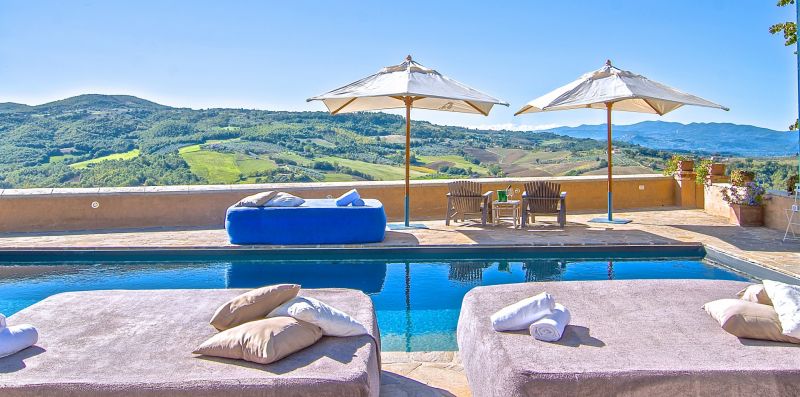 The highlight of the outdoor spaces is the magnificent private panoramic pool, rectangular in shape (10 x 5 m, depth 1.40 m), framed by elegant natural stone paving. Open from May 1st to October 1st, the pool area is equipped with comfortable padded daybeds, sun loungers, umbrellas, an outdoor shower, chairs, and small tables, offering everything needed to relax in total privacy while enjoying views over the surrounding hills.