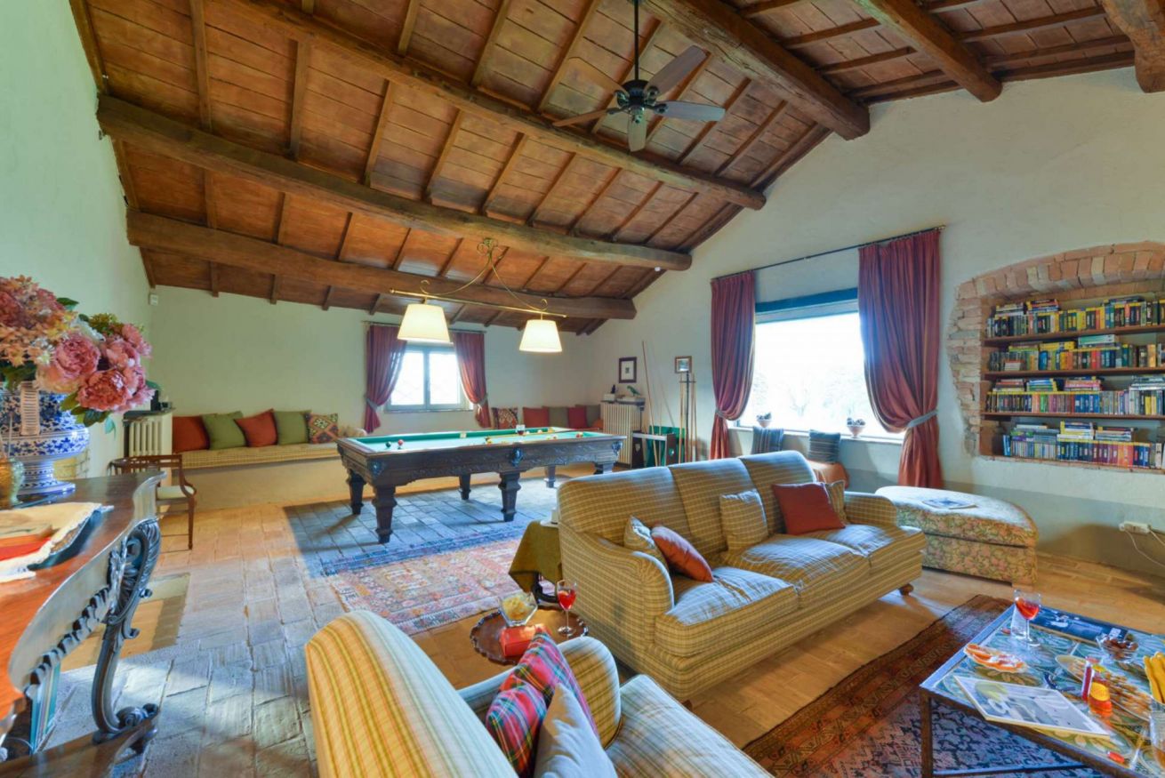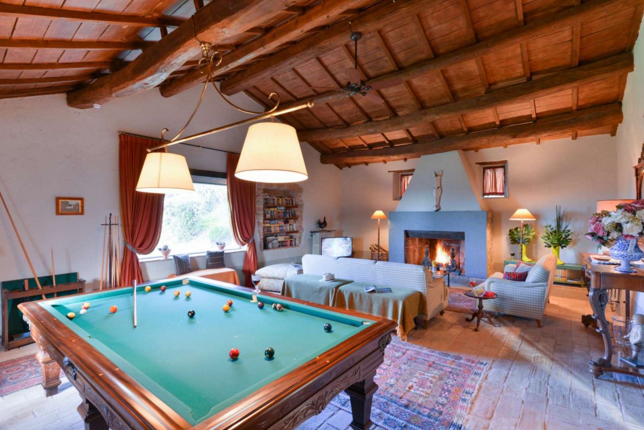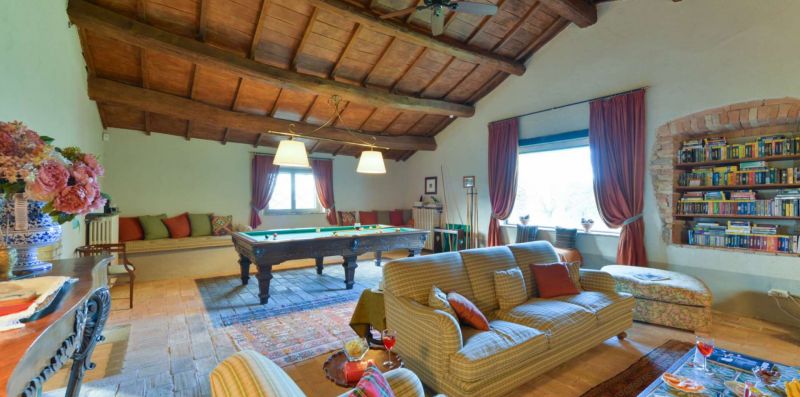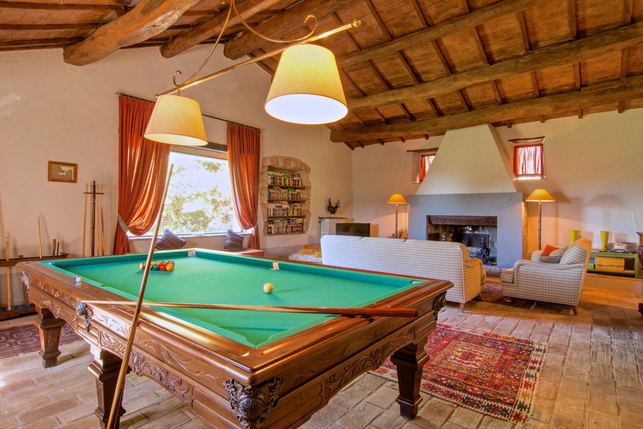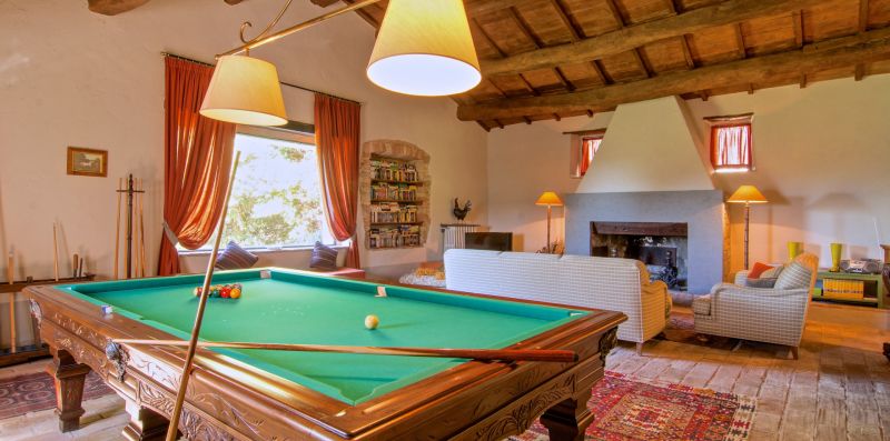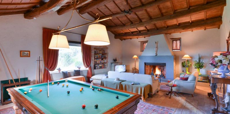 The main entrance leads to a salon of approximately 60 sqm, featuring a large billiard table, a lounge with fireplace and tv, perfect for relaxing or entertaining guests.