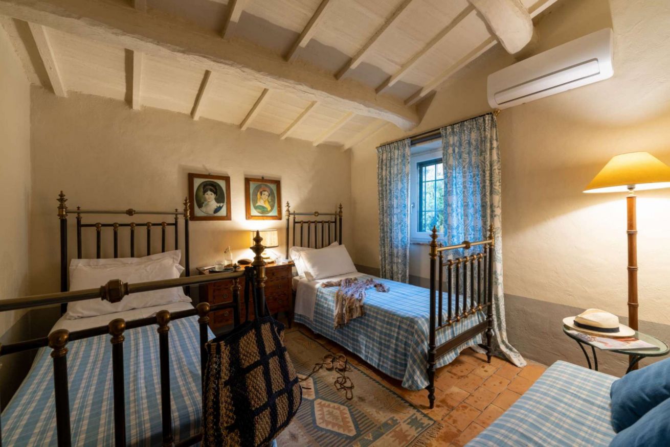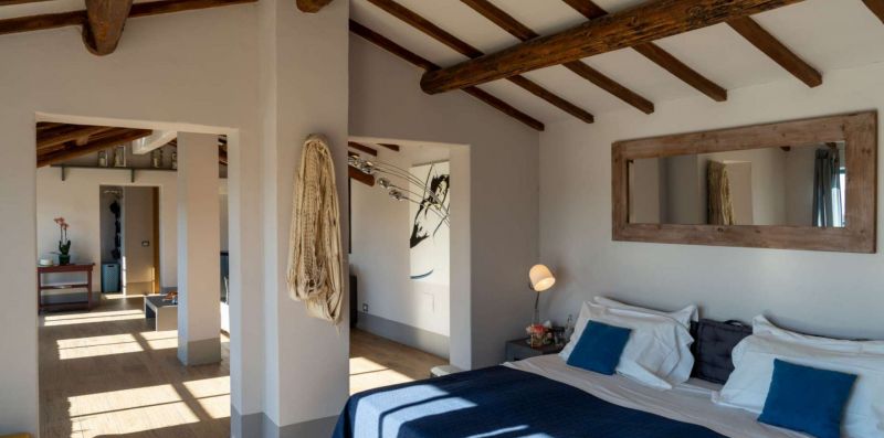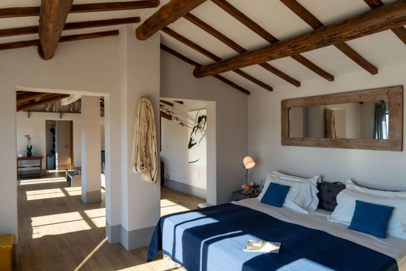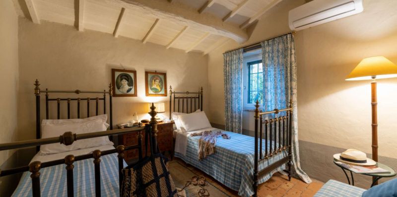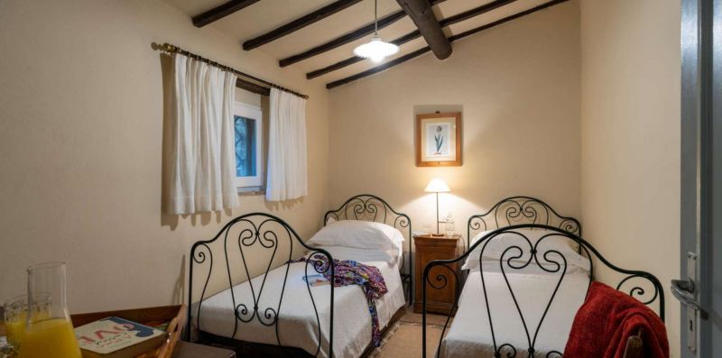 From the six-step staircase in the entrance, you reach a refined reading room with comfortable armchairs and bookshelves, which opens onto the day room with a large hallway connecting the different areas of the house. On this floor, a bedroom with two separate single beds includes an en-suite bathroom; although it does not have air conditioning, it remains a cool and pleasant environment.