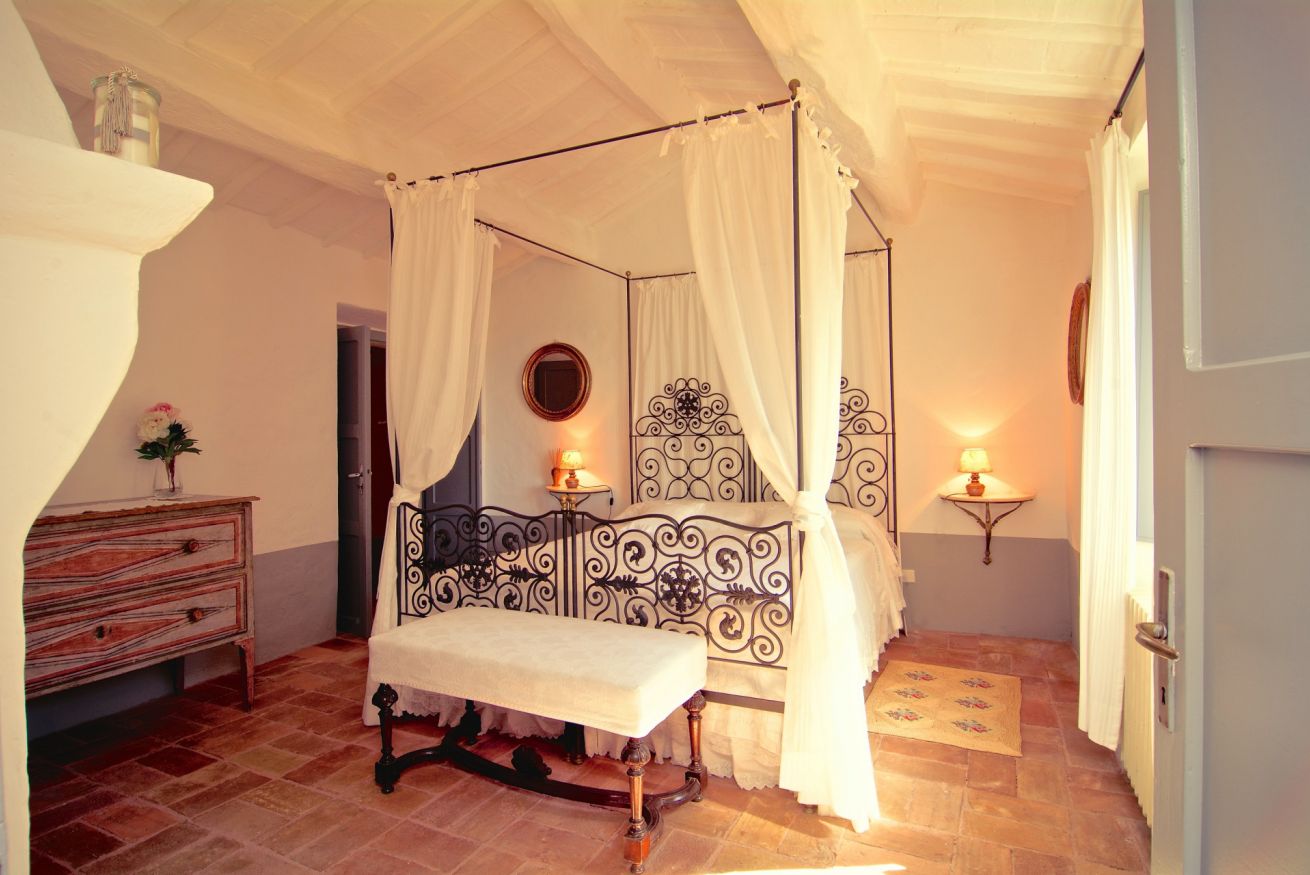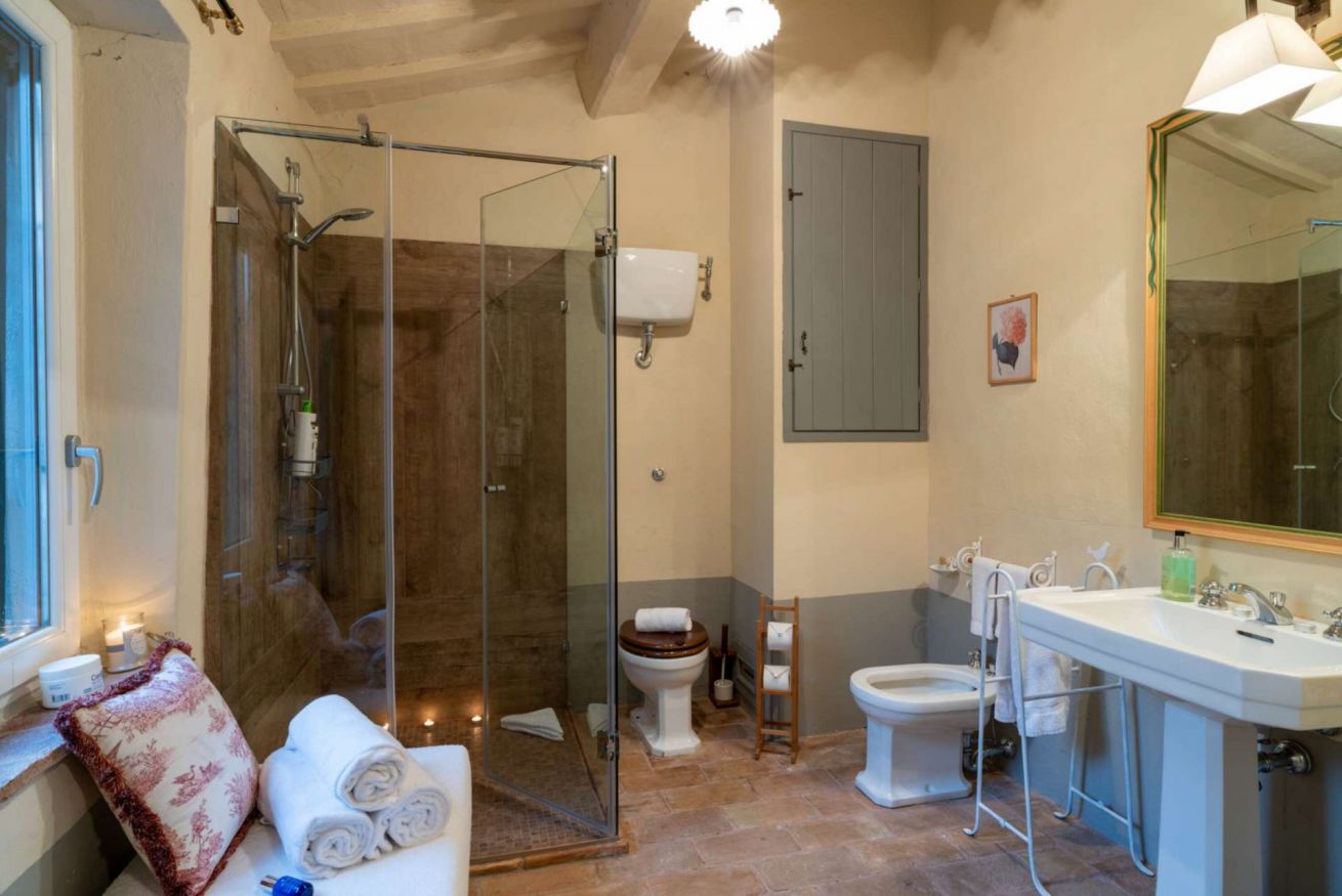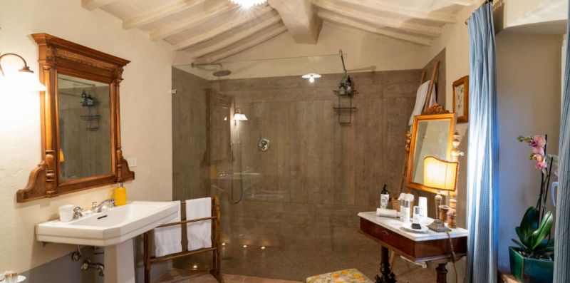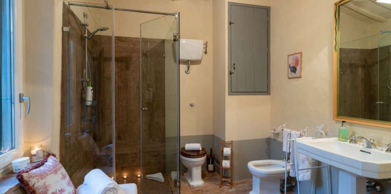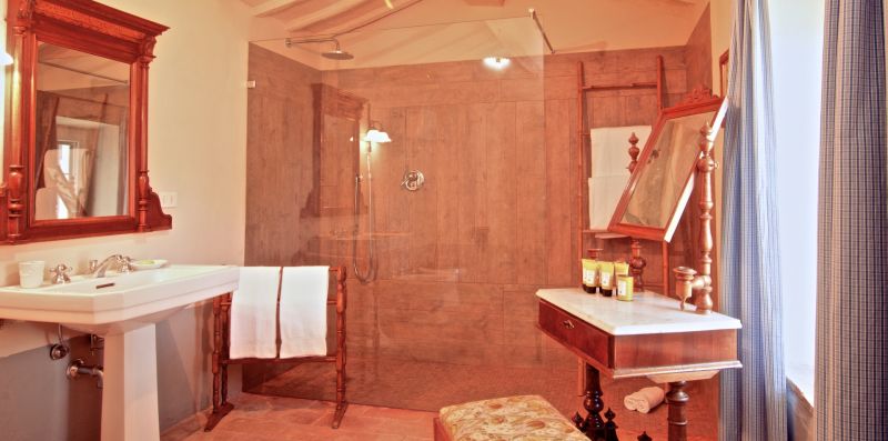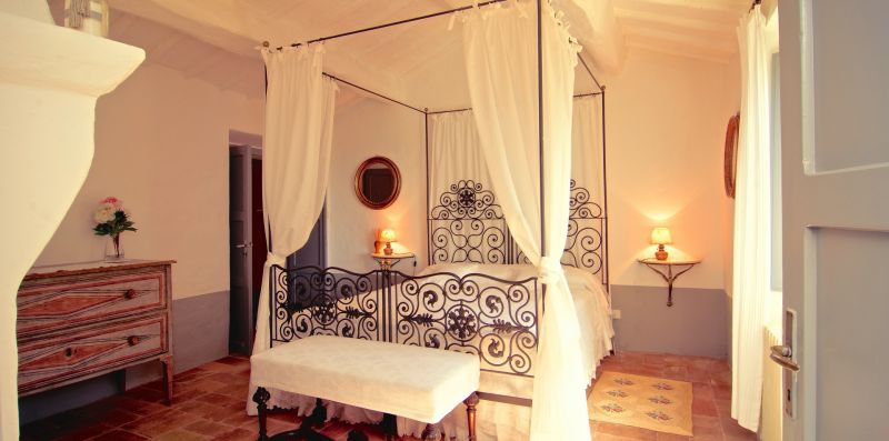 Climbing five more steps leads to the master bedroom, elegant and spacious, with a four-poster bed, fireplace, air conditioning, and a large en-suite bathroom with a bathtub, ideal for moments of total relaxation. A corridor then leads to two double bedrooms – one with separable beds – both equipped with air conditioning and a shared bathroom with shower, separated by a practical hallway.