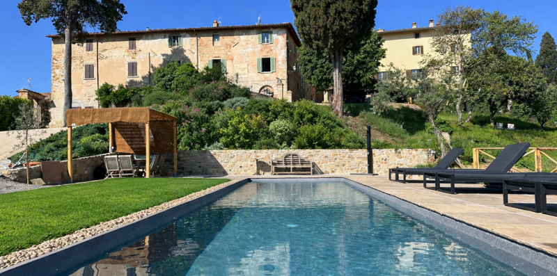 Next to the pool, there is a comfortable gazebo with a dining table, ideal for leisurely breakfasts, lunches, and dinners outdoors, or simply for enjoying a relaxing moment with an aperitif or a good book, immersed in the silence of the countryside.