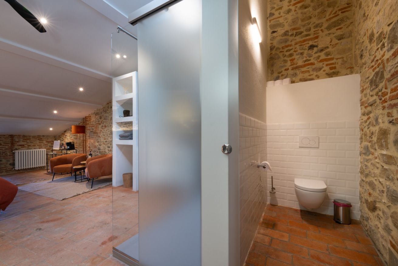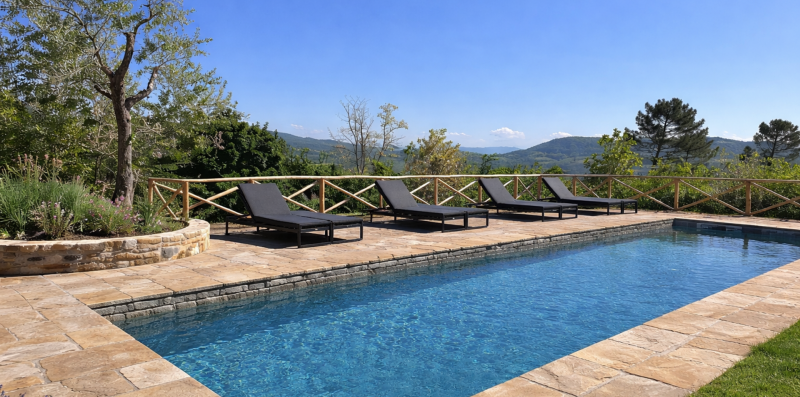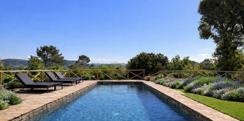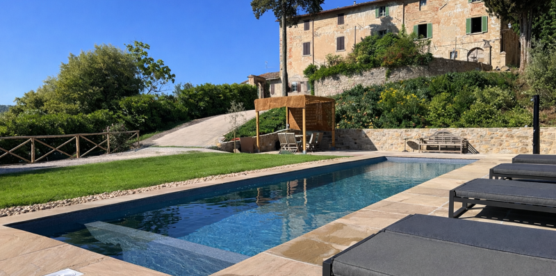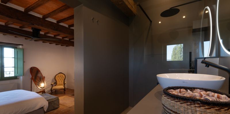 The heart of the outdoor space is the stunning private infinity pool (5 x 15 m, depth 155 cm), open from May to October and equipped with elegant sun loungers and an outdoor shower: the perfect place to cool off and enjoy long summer days under the Umbrian sun.