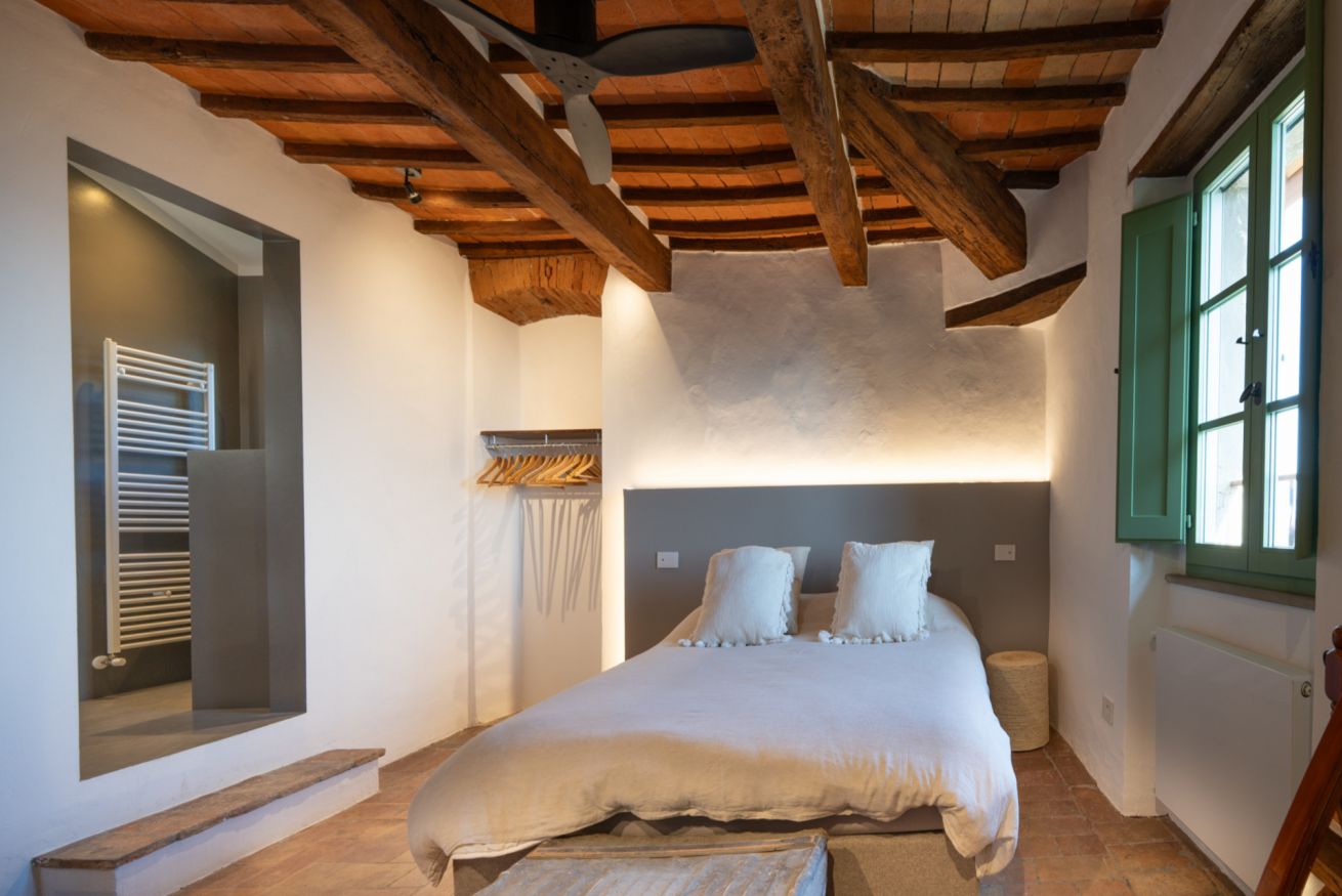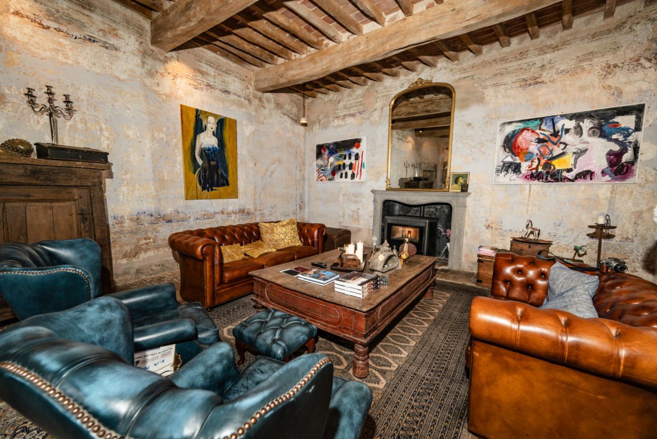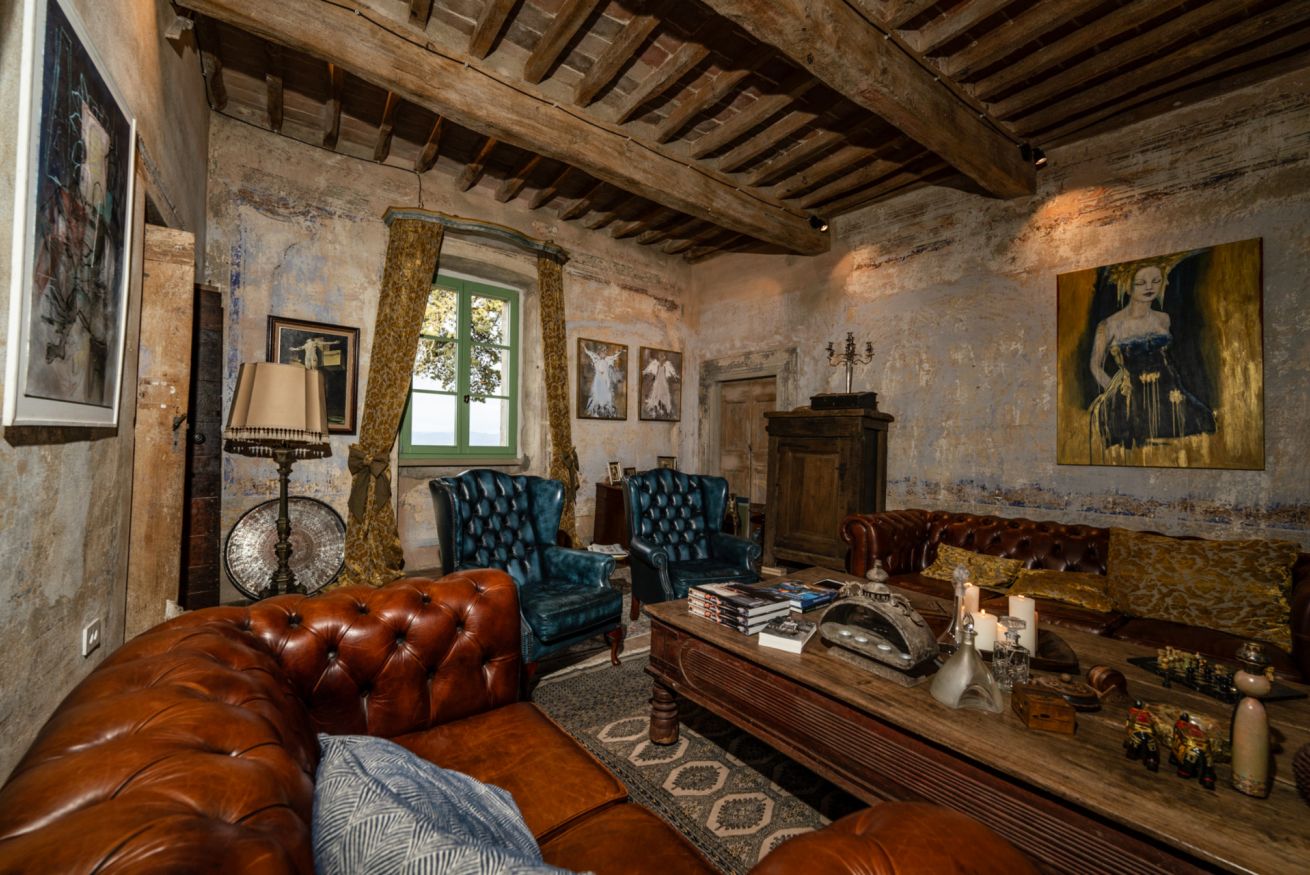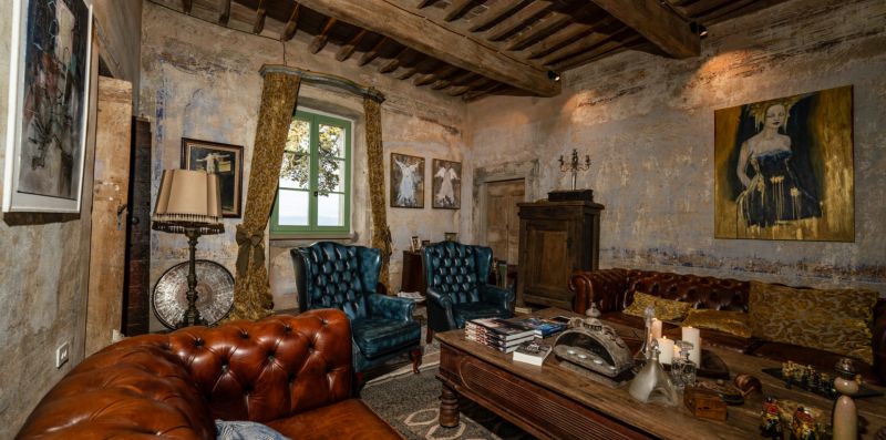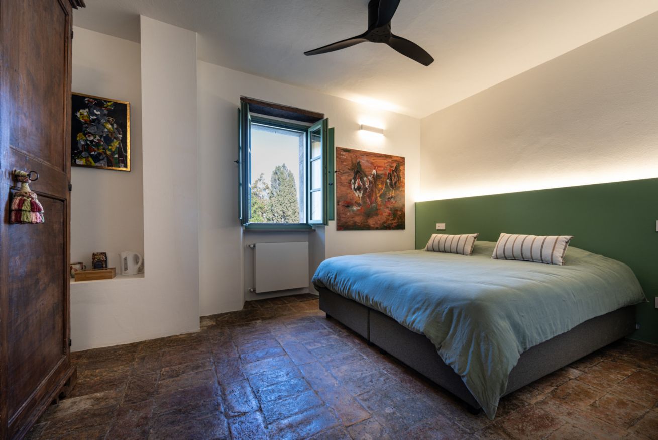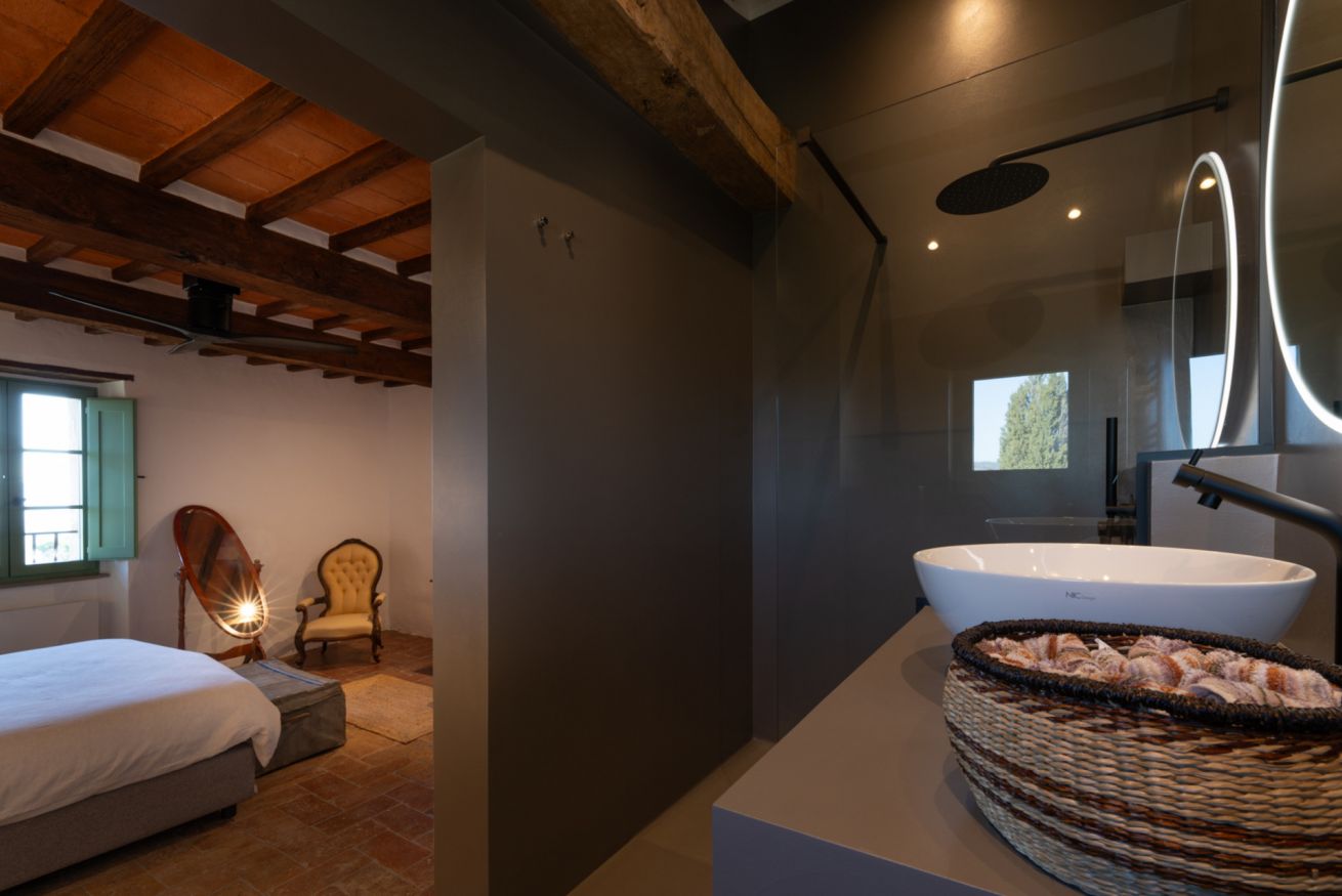 Outside, the property is surrounded by a meticulously maintained private garden, where tall cypress trees and Mediterranean plants frame a wide and enchanting view of the surrounding hills, while in the distance the Apennine Mountains provide a lush and majestic backdrop. This setting ensures complete privacy and a tranquil atmosphere.