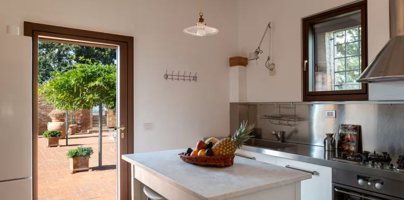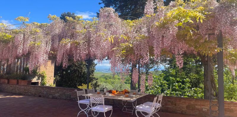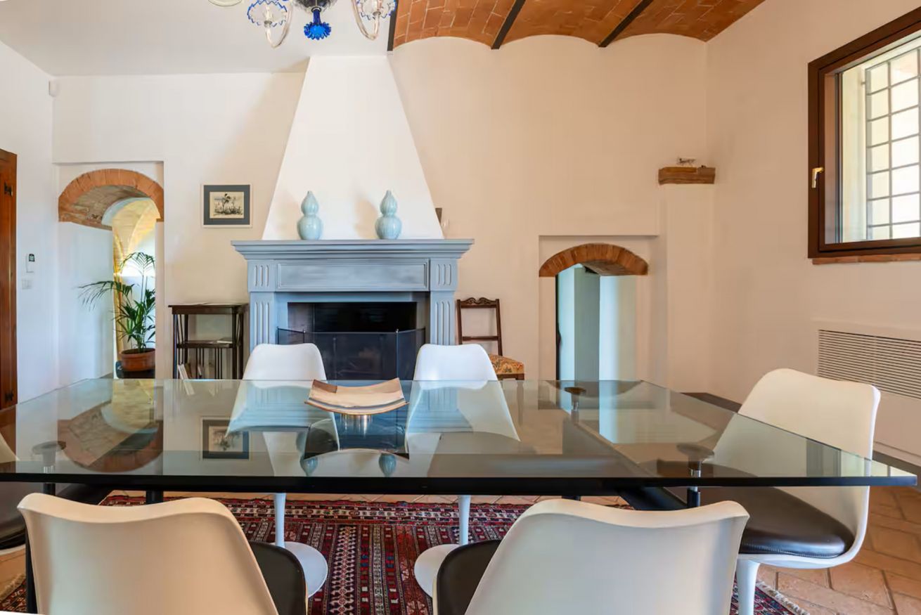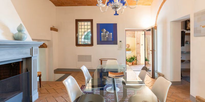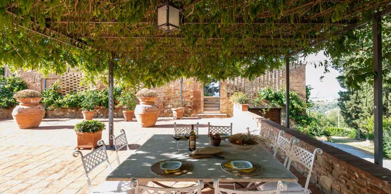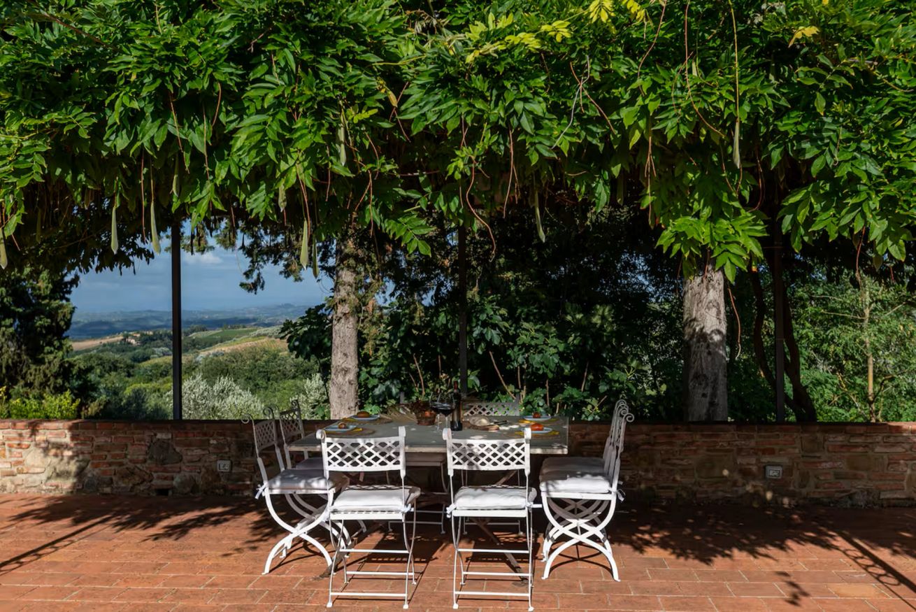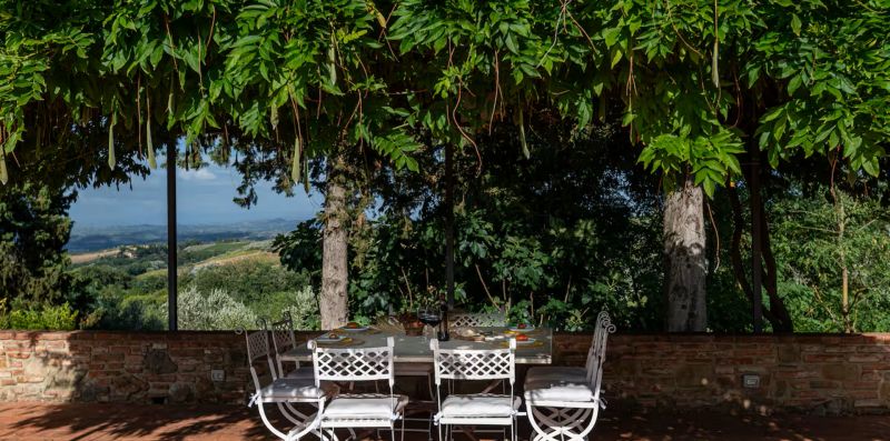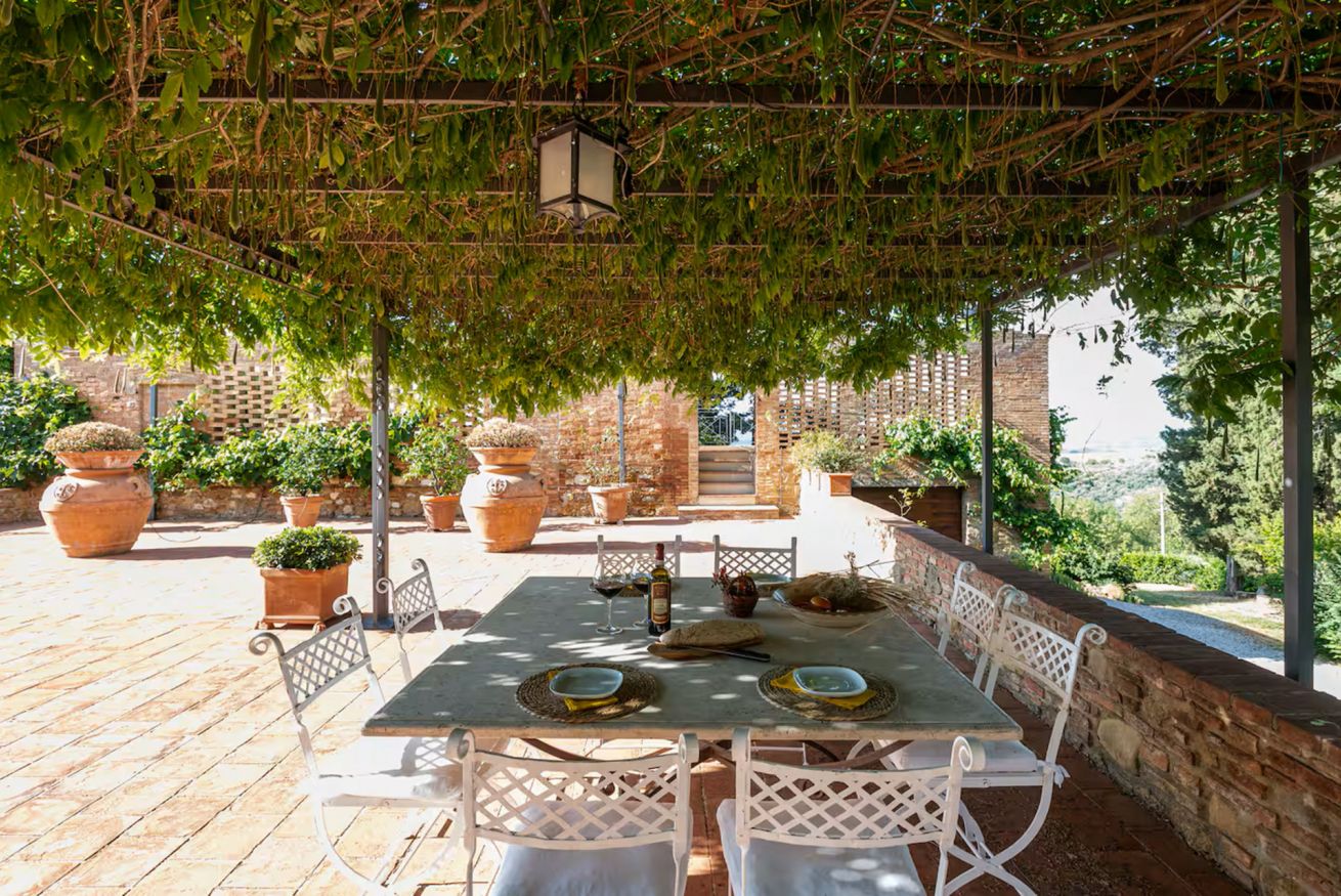 The outdoor spaces are designed to fully enjoy the beauty of the Tuscan countryside. The villa features a spacious courtyard, accessible directly from the kitchen door, equipped with a table, chairs, and lounge seating, perfect for meals, relaxation, or aperitifs outdoors. From the courtyard, guests can access a panoramic terrace overlooking the Tuscan hills, offering unforgettable and picturesque views. A large patio with a dining table for 8 invites guests to share pleasant moments outdoors, from sunset dinners to barbecues and wood-fired pizza evenings.
