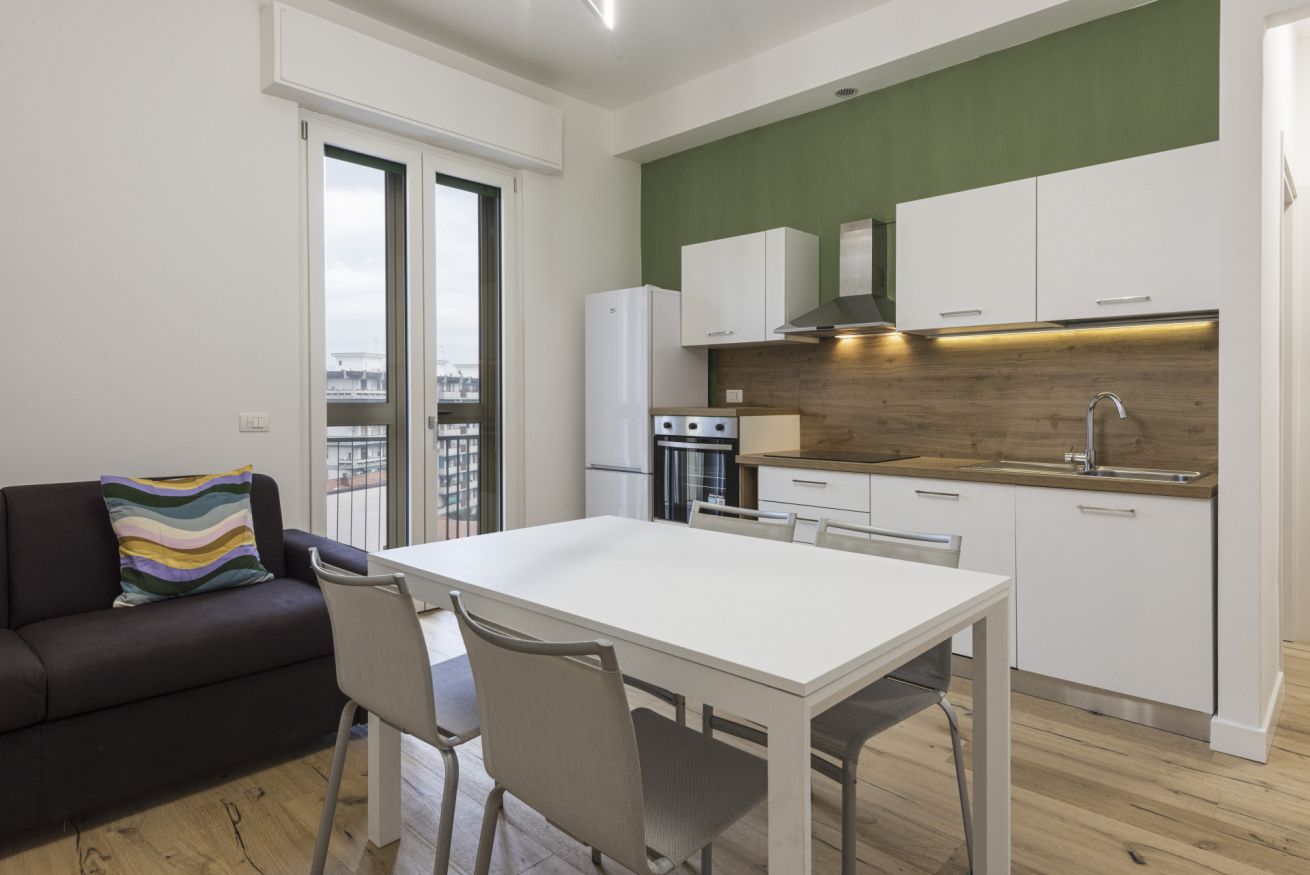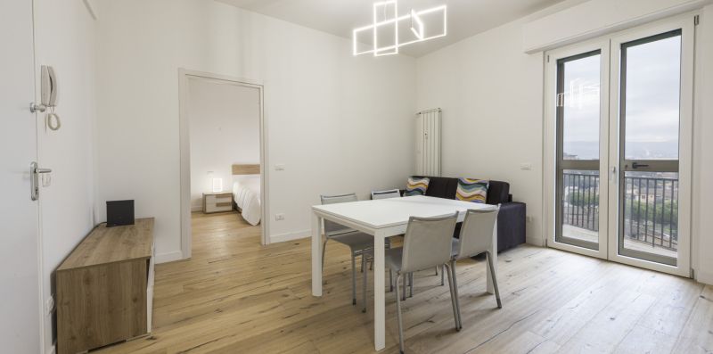 The apartment is located on the sixth floor of a modern building with a lift and stands out for its recent renovation that has made the spaces bright, functional and welcoming. The living area, large and airy, is characterized by a contemporary design with an open kitchen, perfectly equipped with an oven and dishwasher. The sleeping area includes two bedrooms: one double and one with two single beds, ideal for families or groups of friends. The bathroom, elegant and with attention to detail, has a modern shower.