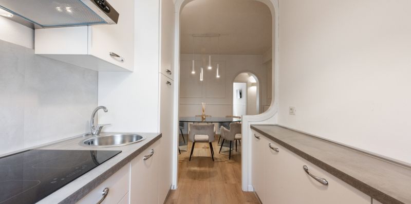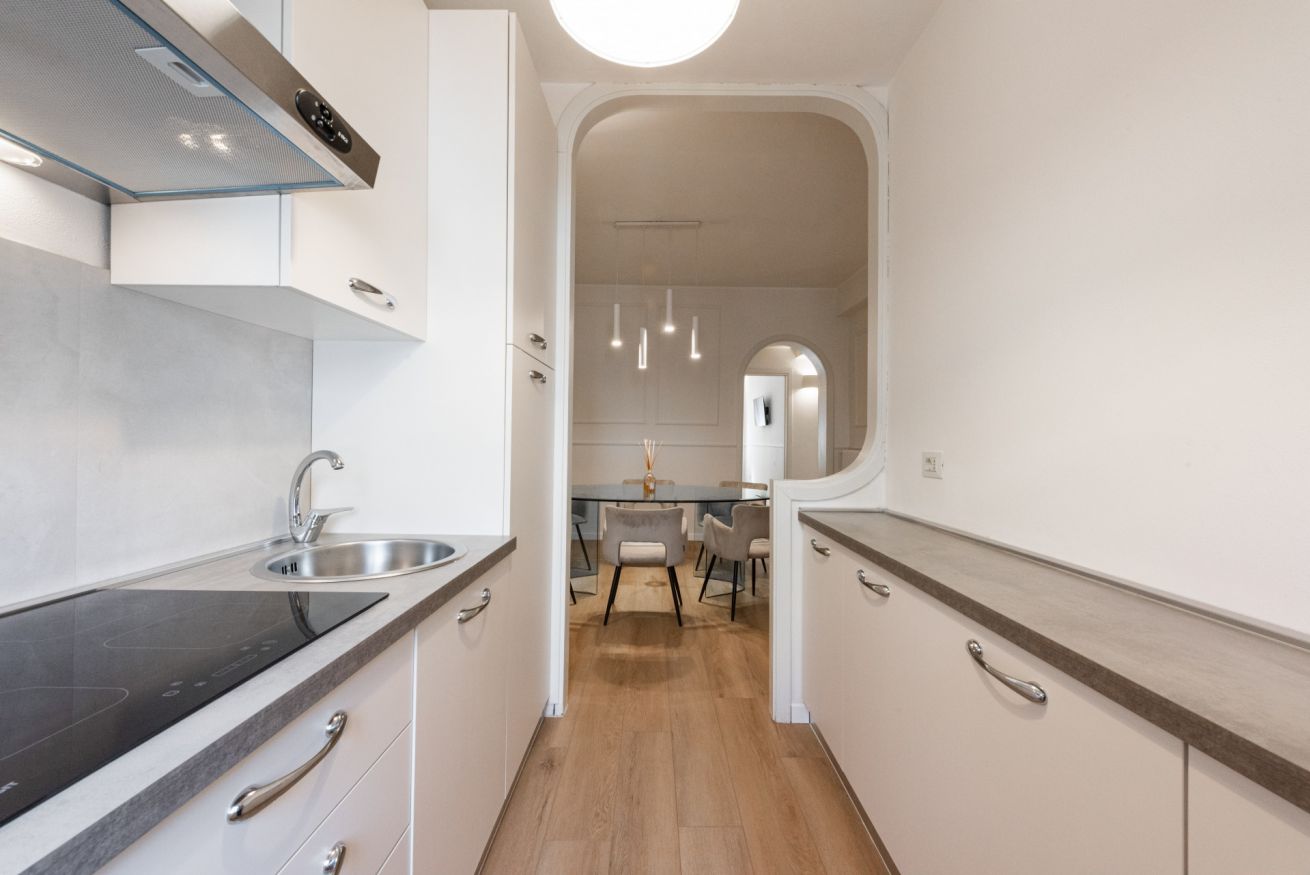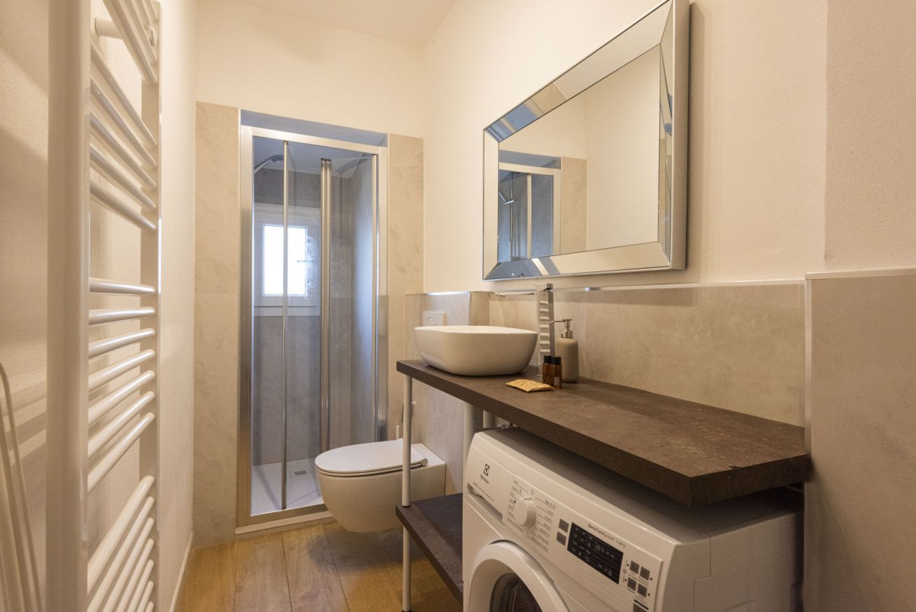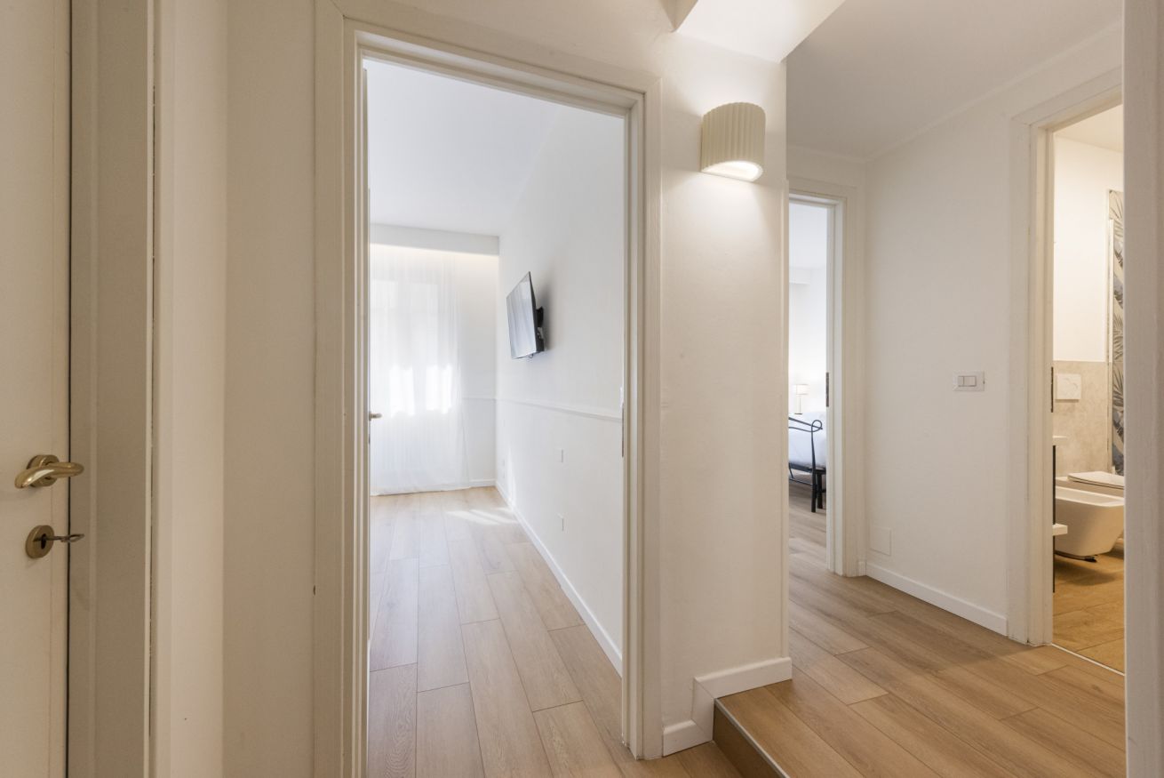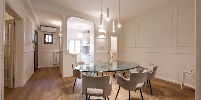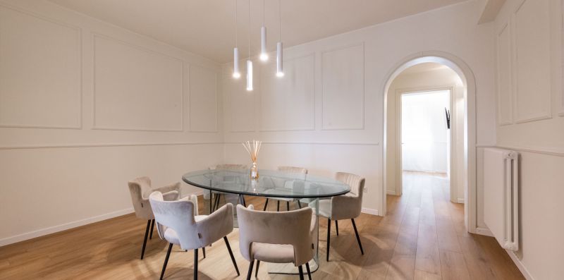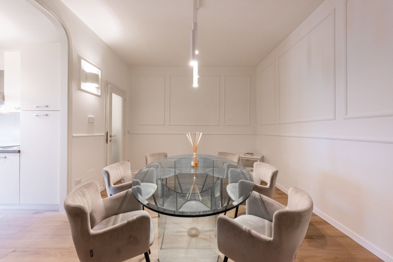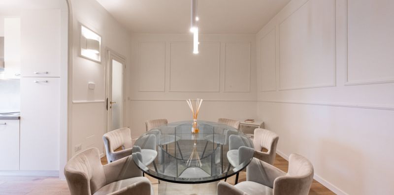 The apartment is located on the third floor of a historic building without an elevator and has recently been completely renovated. The interiors are furnished in a contemporary style, with clean lines and bright spaces that make the home particularly welcoming and pleasant to live in. Wooden floors contribute to a warm and refined atmosphere, further enhancing the space.