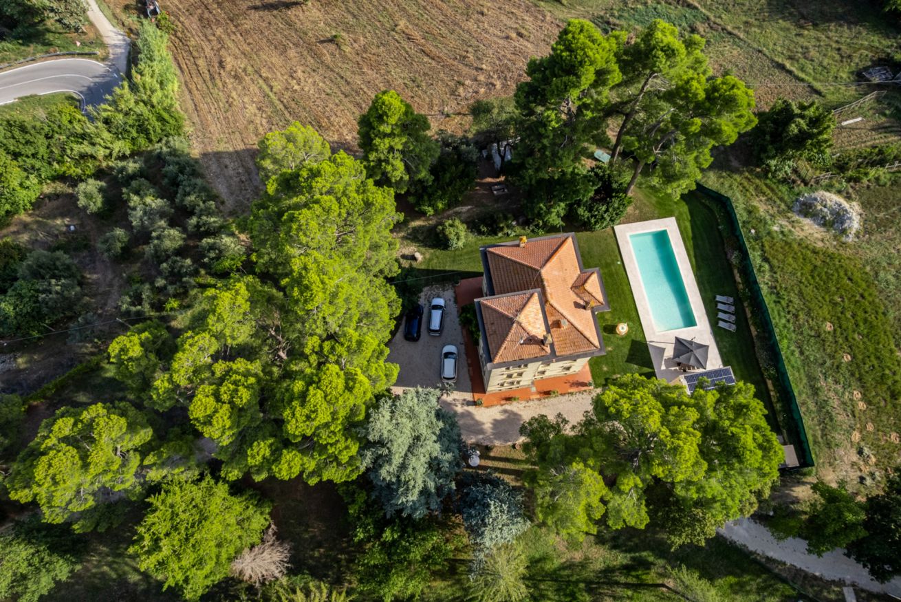 Villa Fazia is nestled in the Marche countryside, precisely in Ortezzano, a picturesque village in the province of Fermo. Perched on a hill, Ortezzano boasts a well-preserved Medieval fortress from which you can enjoy panoramic views of the surrounding countryside, olive groves and vineyards.