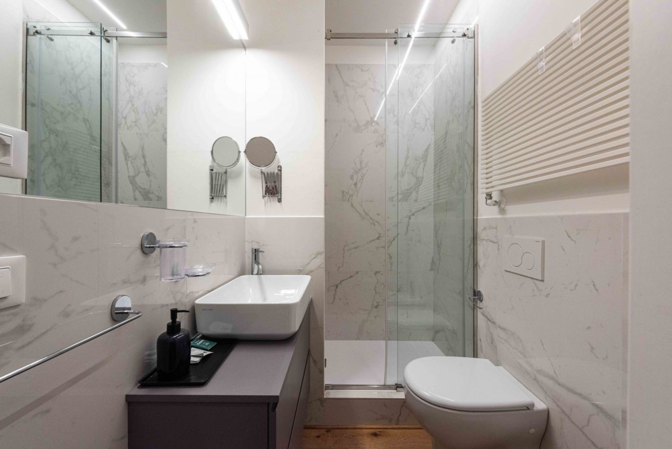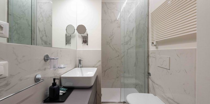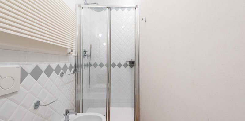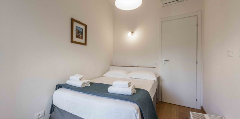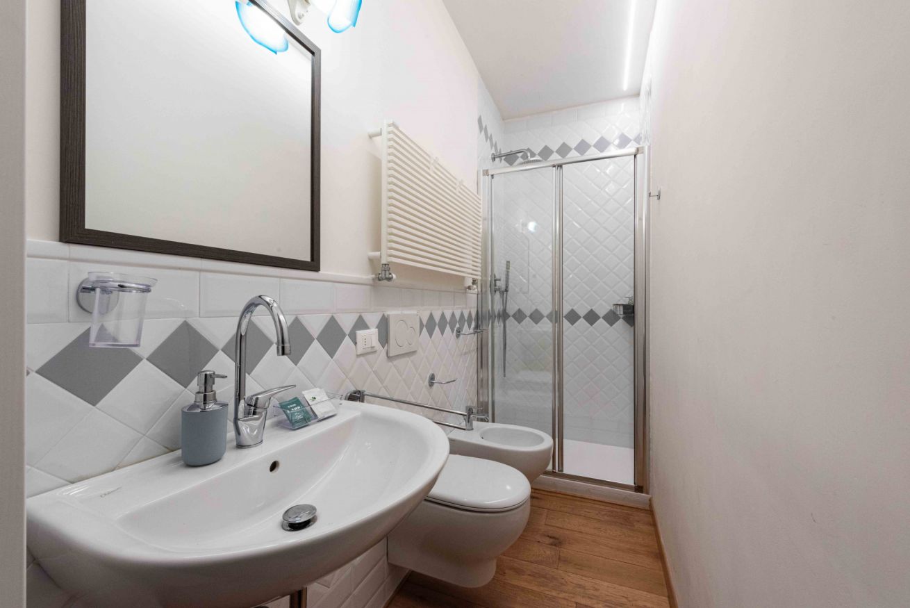 The sleeping area consists of two double bedrooms, plus the option of using the double sofa bed in the living room, allowing for up to six guests. Functionality is ensured by the two bathrooms, both complete with shower and bidet, and a charming small terrace offering private outdoor space.